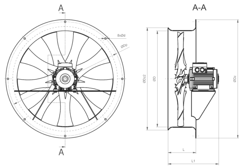 | Nr produktu | Typ wentylatora | ØD | ØDz2 | ØDp | ØDz | L | L1* | n x Ød |