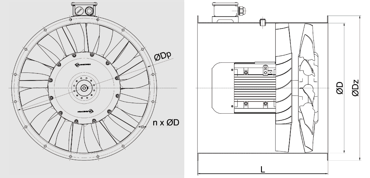 Typ wentylatora | ØD | L | ØDp | ØDz | n x Ød |