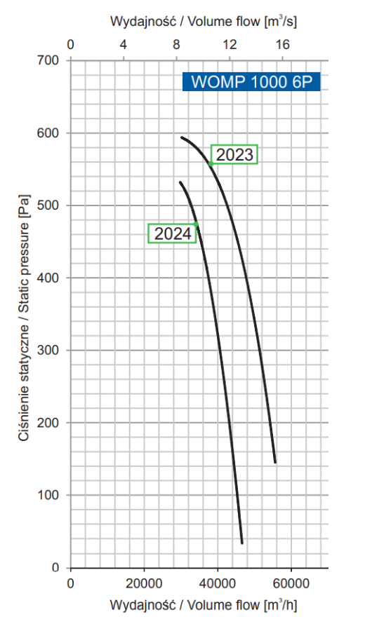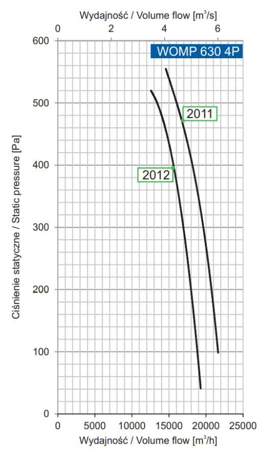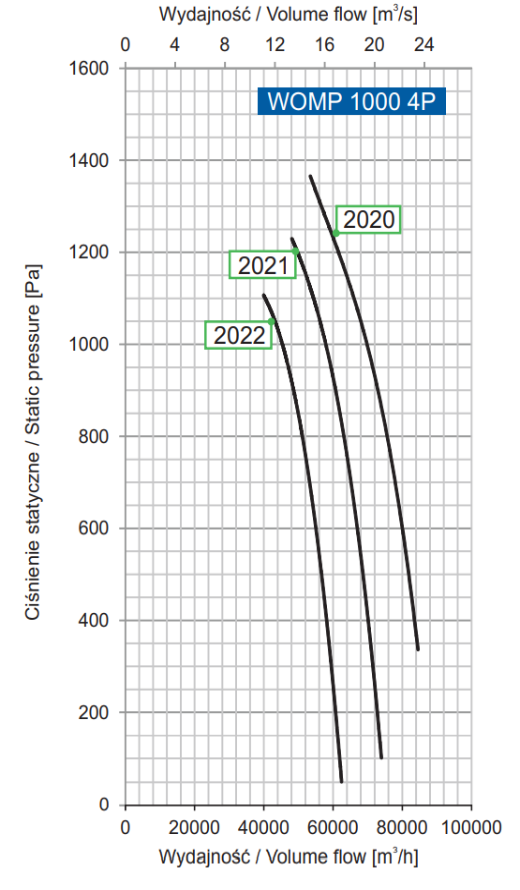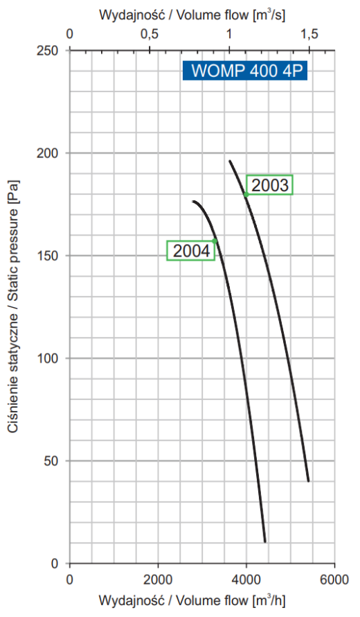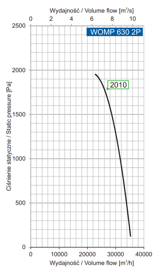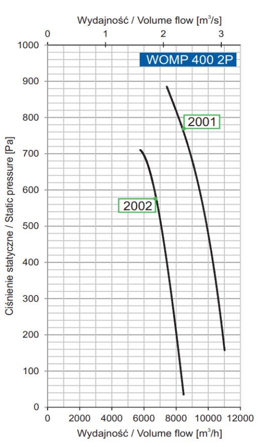 | Numer produktu | Typ wentylatora | Moc silnika [kW] | Prąd przy napięciu 3~400 V [A] | Prędkość obrotowa [min-1] | Wydajność maksymalna [m3/h] | Maks. ciśnienie statyczne [Pa] | Poziom Ciśnienia Akustycznego [SPL] | |